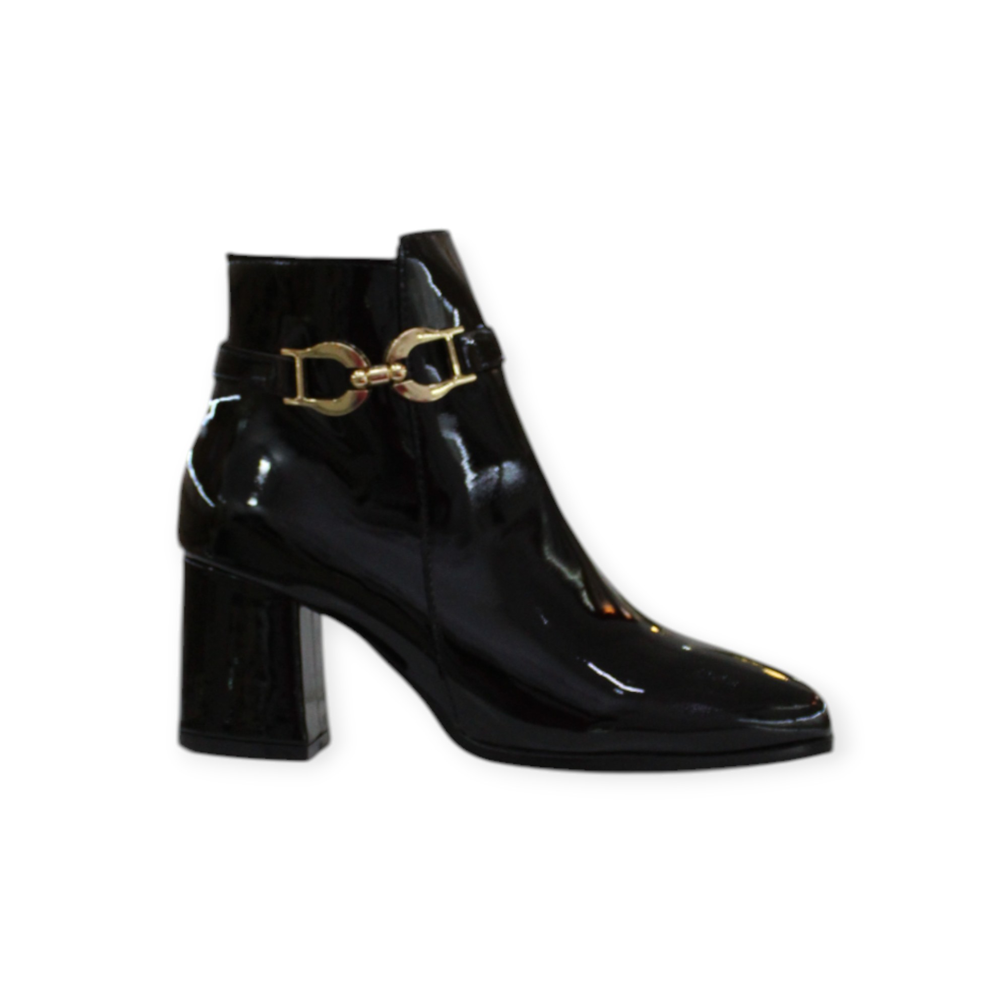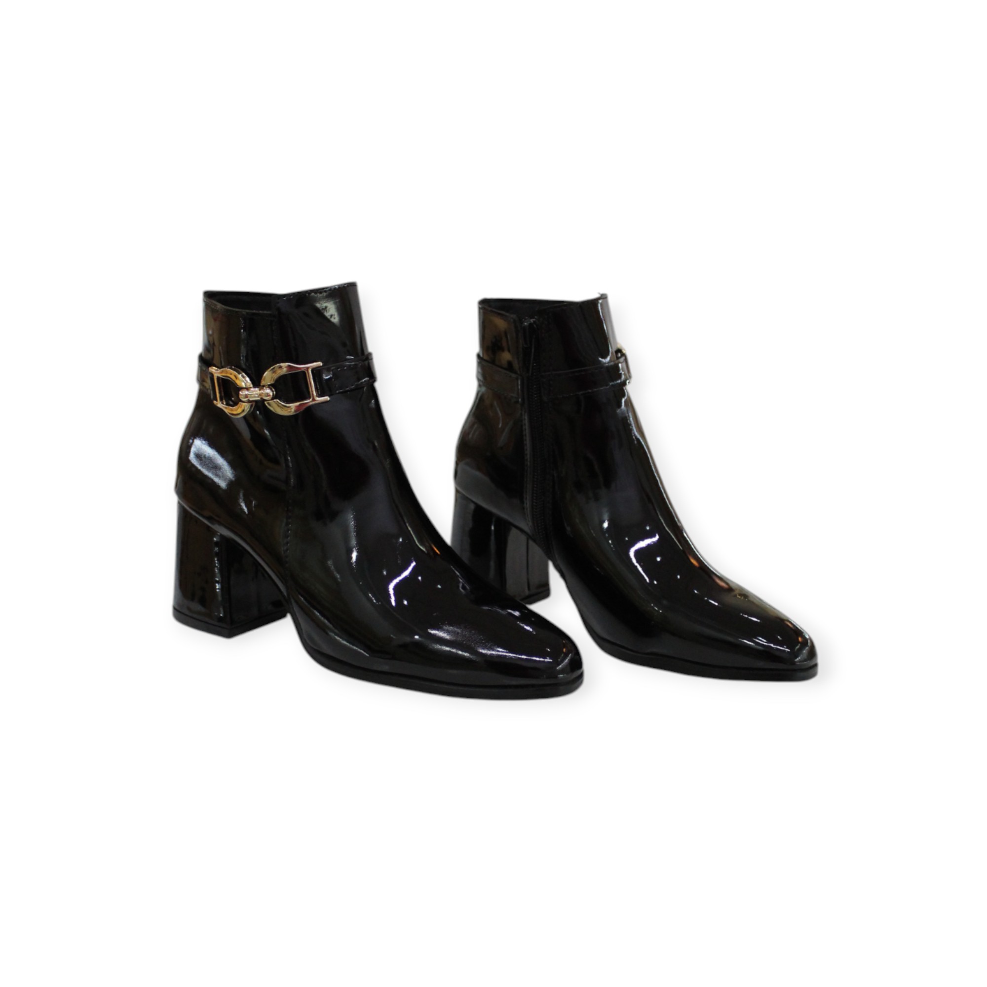 Botin color negro en material charol sintético, con aplicaiones en color dorado, tacón ancho con altura 6.5cm. Hecho en México