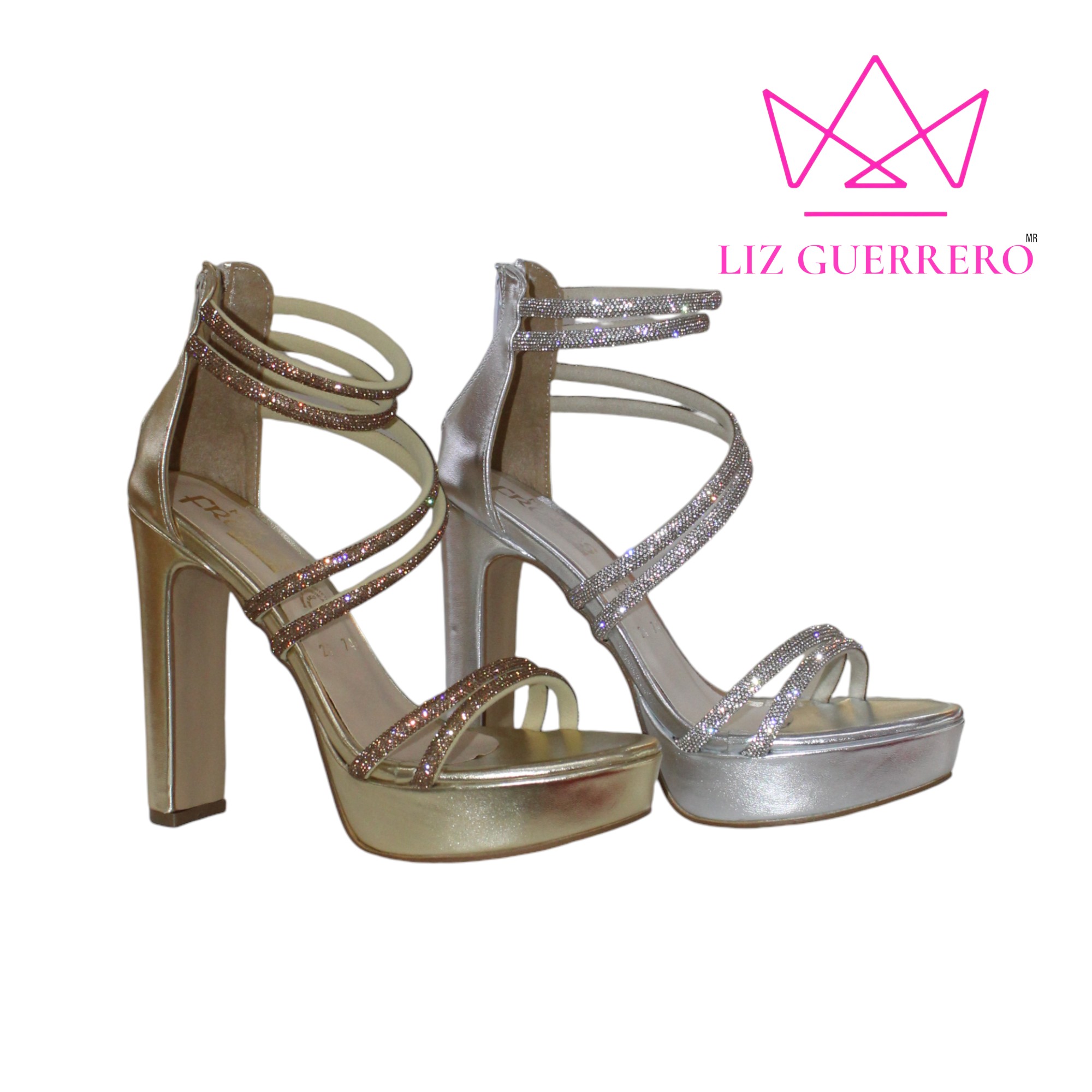 Zapatilla en oro y plata en material sintético napa, altura de tacón 12cm, plataforma 3cm. Hecho en México.