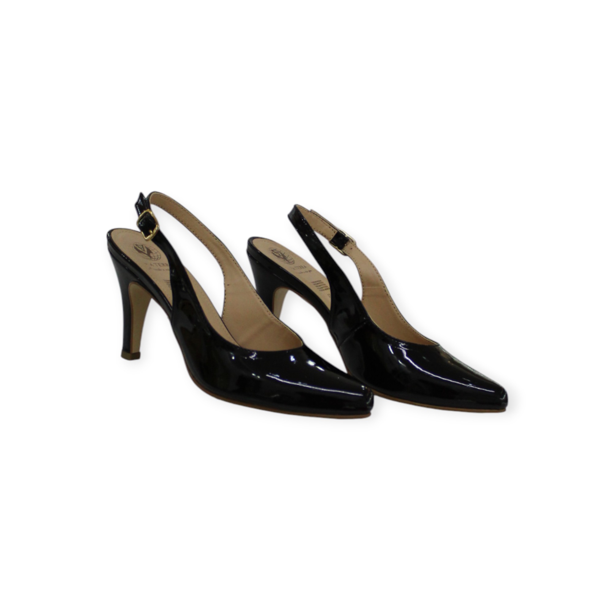 Zapatilla en charol sintético, disponible en colores: negro, beige y kaki, altura de tacón 8cm. Hecho en México.