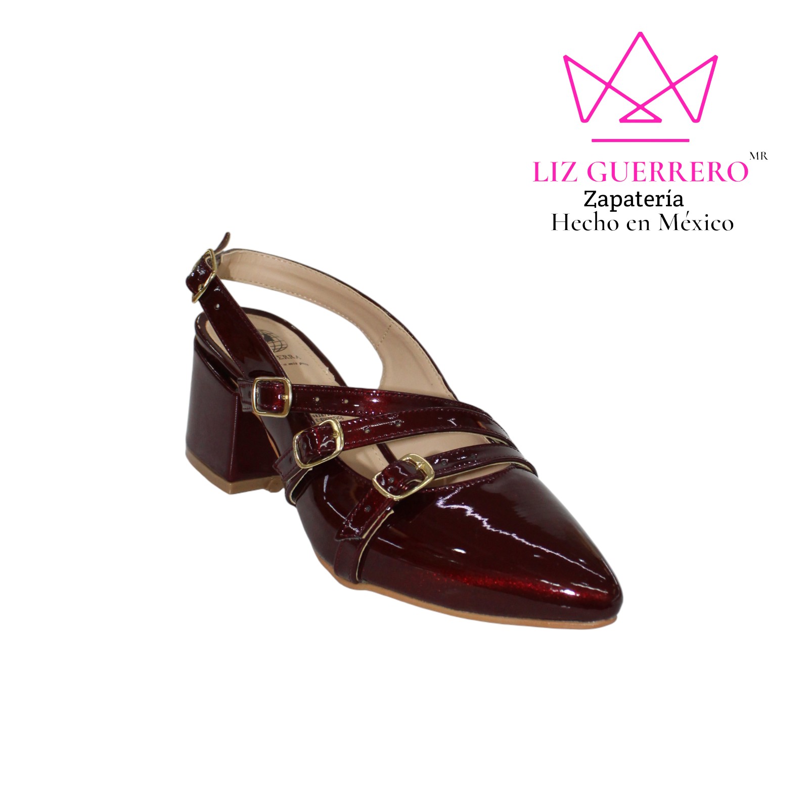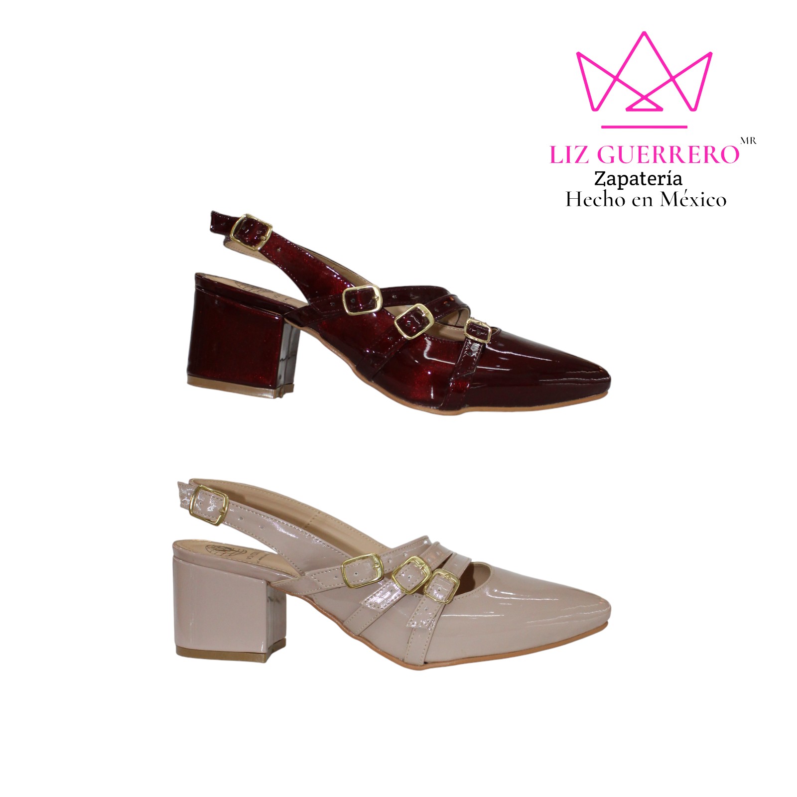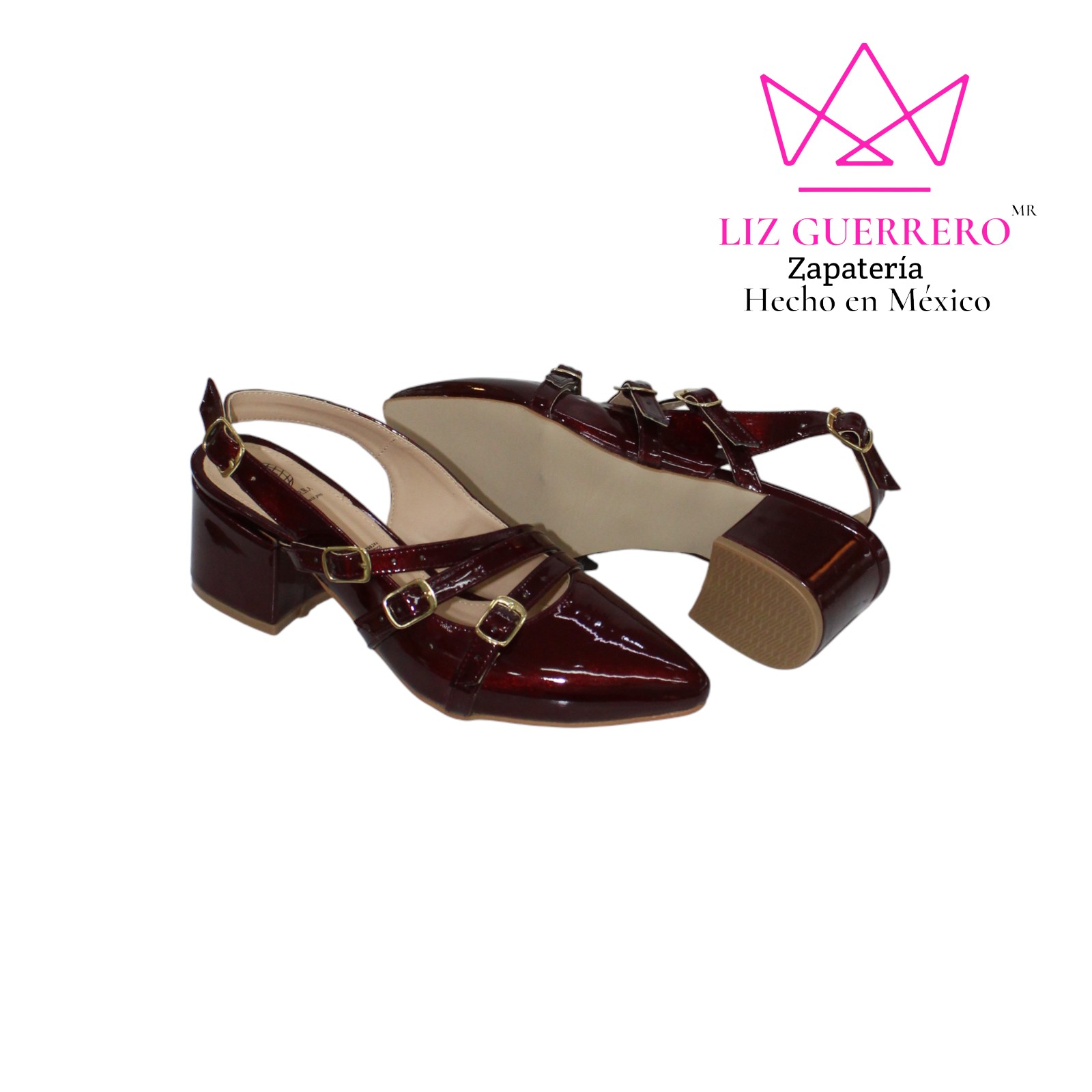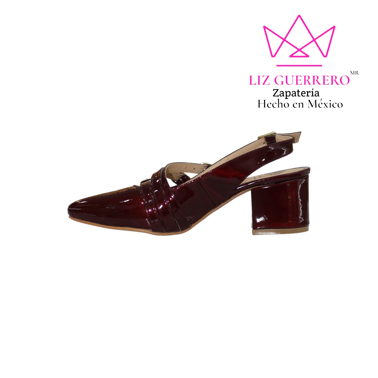 Zapato en material charol sintético, en acabado stiletto, tacón cuadrado con altura de 5cm, suela antiderrapante. Hecho en México.