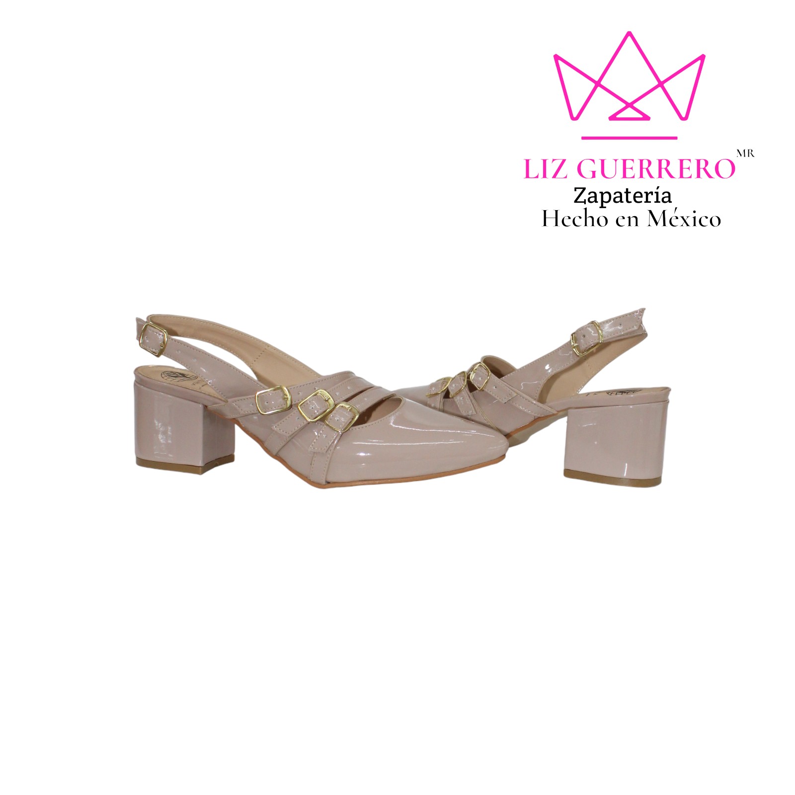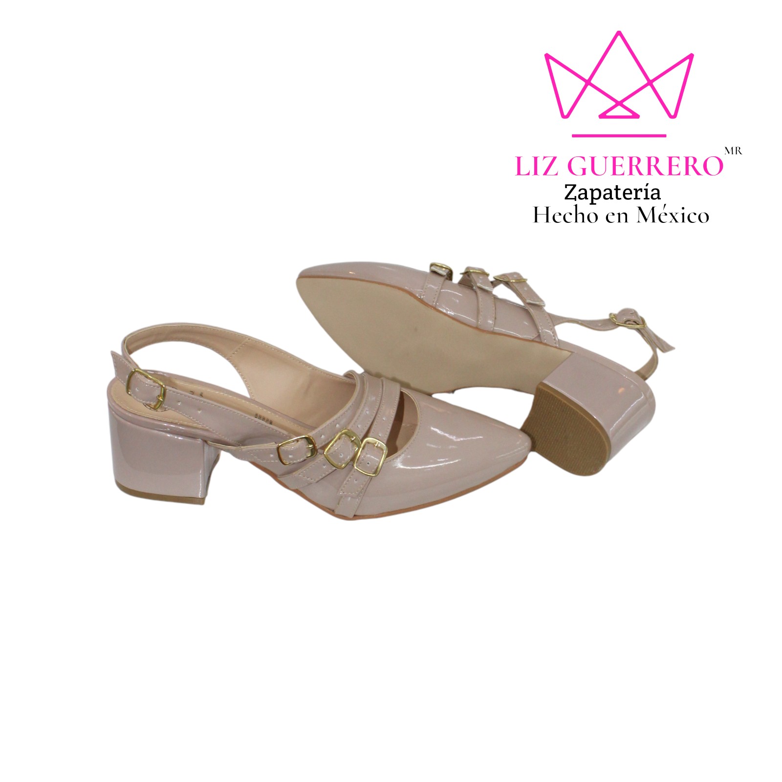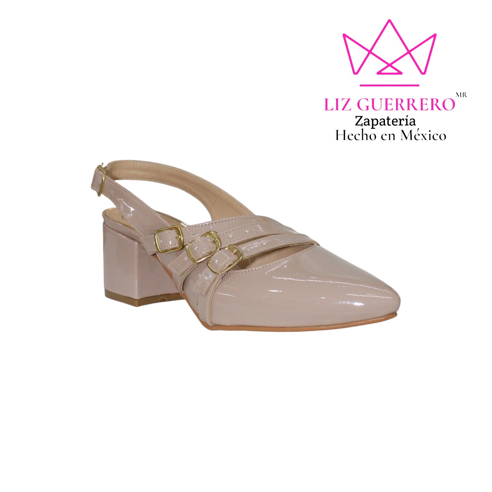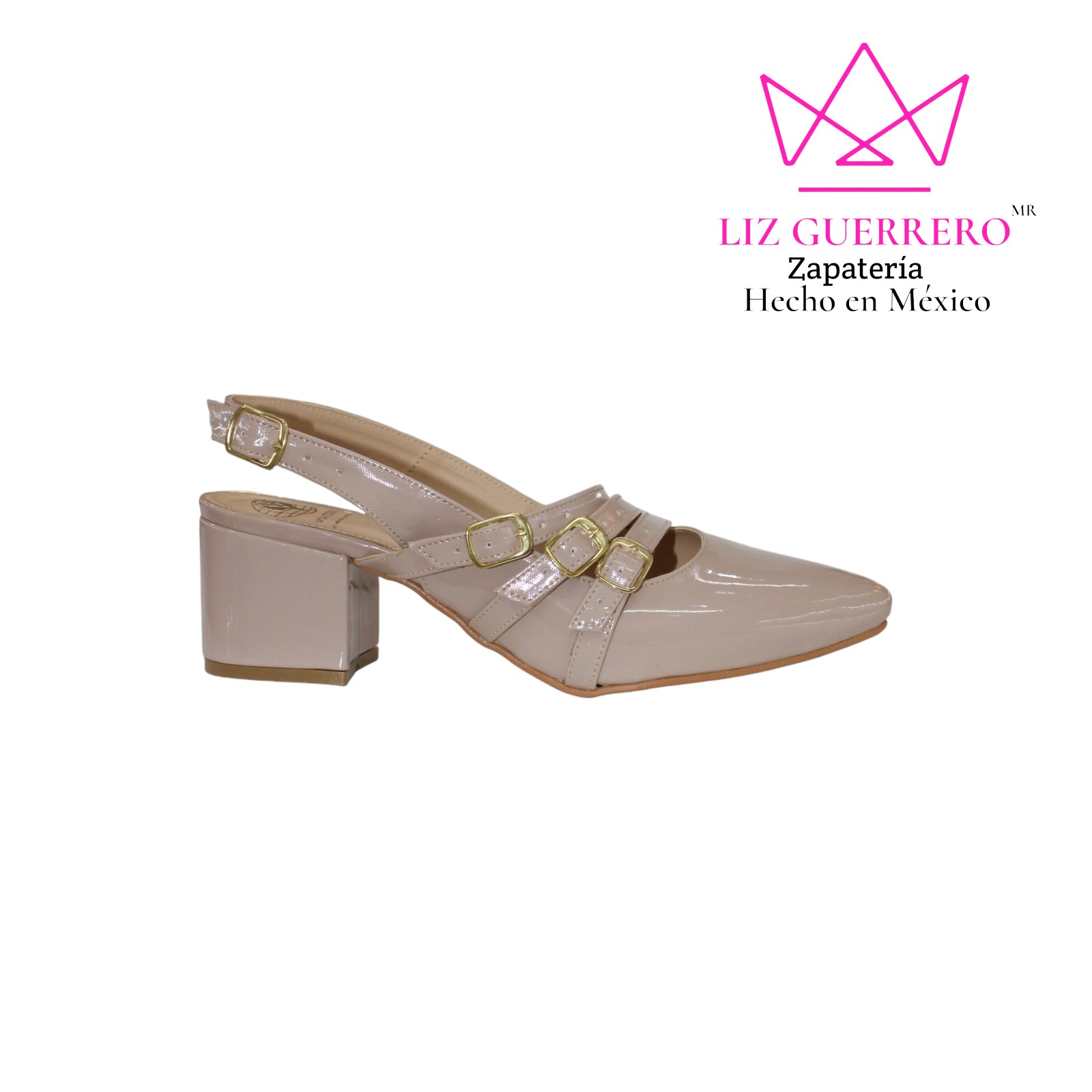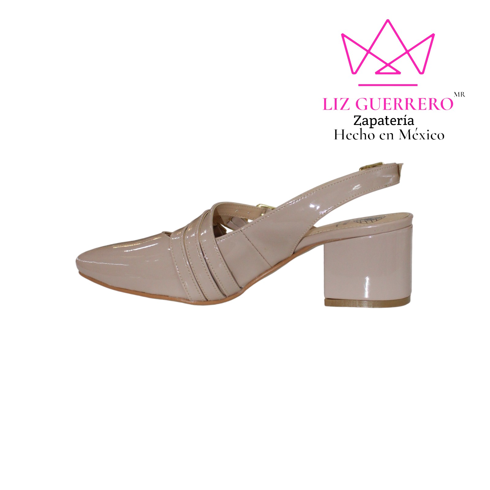 Zapato en material charol sintético, en acabado stiletto, tacón cuadrado con altura de 5cm, suela antiderrapante. Hecho en México.